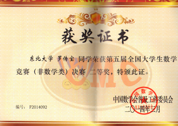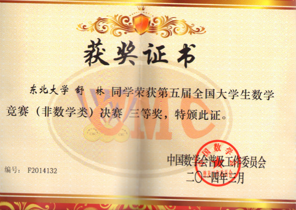 第五届全国大学生数学竞赛决赛于3月14日至17日在中国科技大学(合肥)举行,我校学生以辽宁省预赛第一名和第二名的成绩代表东北大学参赛,最终理学院罗传宝同学获全国二等奖,信息学院舒林同学获全国三等奖的好成绩。