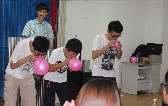 晚6:30主持人宣布竞赛开始,并宣布比赛规则。活动共进行了四个环节,第一环节“单刀赴会”,考查每个队员的个人能力。经过一轮比拼,大家的差距并不大,可见每个同学的实力都不容小觑。接下来进行的第二环节“团队竞技”,考查的是团队的协作能力,这一轮比试下来,可以看出一些差距。为活跃气氛,放松大家的心情,更是为了让大家积蓄力量准备下一环节的比赛,在第二环节结束之后,由刘阳同学进行吉他演奏,旋律止而比赛起。最为激动人心的时刻到了,接下来便是全过程最为激烈也是最为精彩的第三环节“抢得天下”,这个环节考查的不仅是知识更重要的是速度,先吹破气球者抢得答题机会,似乎有两个队伍专为本环节而来,在大家都没有反应过来的时候,气球爆破声在教室响起,真是意想不到,这一节也几乎变成是2组和5组的比赛,差距在这个环节拉大。会不会有精彩逆袭,且看第四环节“鹿死谁手”,选出一名队员参加这一环节的比拼,寄托整个团队的希冀,参赛队员也是集紧张和激动于一身,随着一个一个的答题完成,比赛也接近尾声。最后,全体参赛成员以及观众进行了亲切的互动,并由主持人抽出来5名幸运观众。至此,本次活动圆满结束。