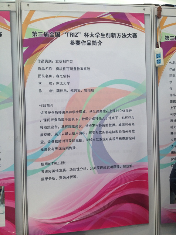 我校今年为首次参加本竞赛,今后学校将加强在本科生中进行“TRIZ理论”等有关创新方法的理论与实践教育,通过理论教学、实践检验,让学生了解和掌握系统的创新方法,进一步提高学生创新意识和实践能力。(项目部供稿)