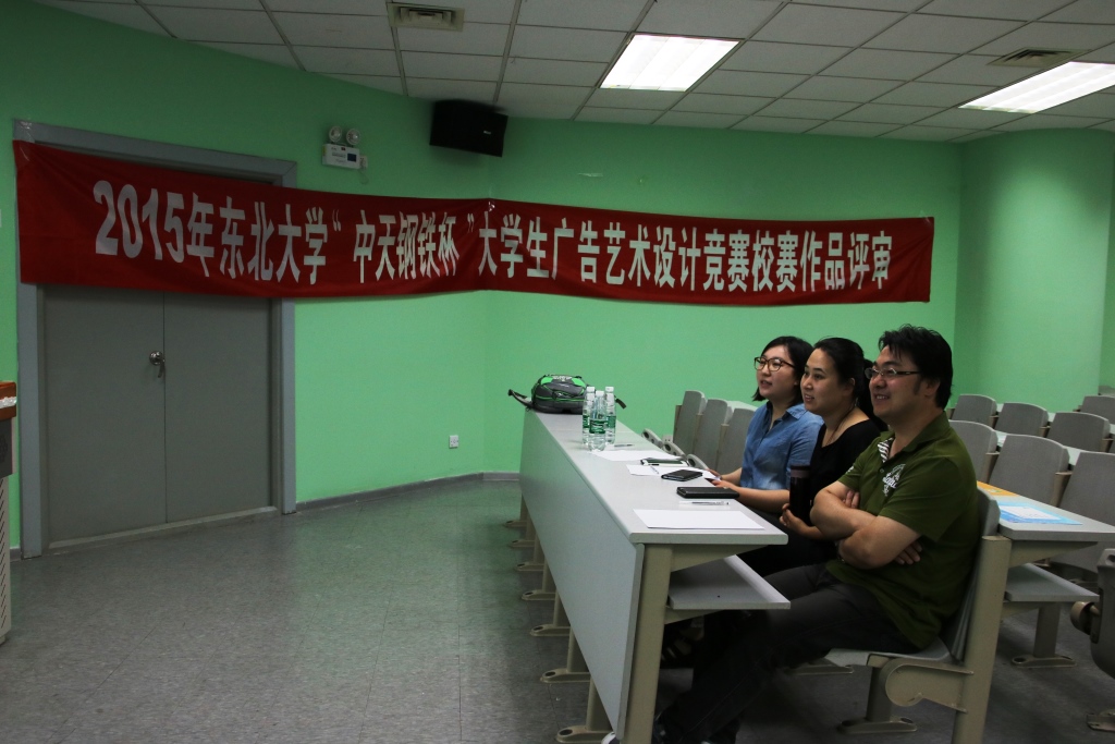 5月29日上午9时,2015年东北大学“中天钢铁杯”大学生广告艺术设计竞赛校赛作品评审会在科学馆206教室举行。艺术学院教师谷会敏、霍楷和樊丁宜作为评审老师出席本次活动。
