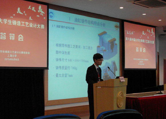 2015年6月5日至7日,“永冠杯”第六届中国大学生铸造工艺设计大赛决赛答辩会在上海大学举行。在第一轮评审中进入全国前10%的24件作品角逐一等奖。我校来自材料与冶金学院的5支本科生队伍入围本次决赛,分获一等奖1项、二等奖4项。