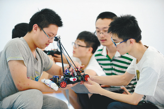 7月20日,在东北大学学生创新创业基地,几名学生正在组装汽车模型。沈阳日报、沈阳网记者 张文魁摄