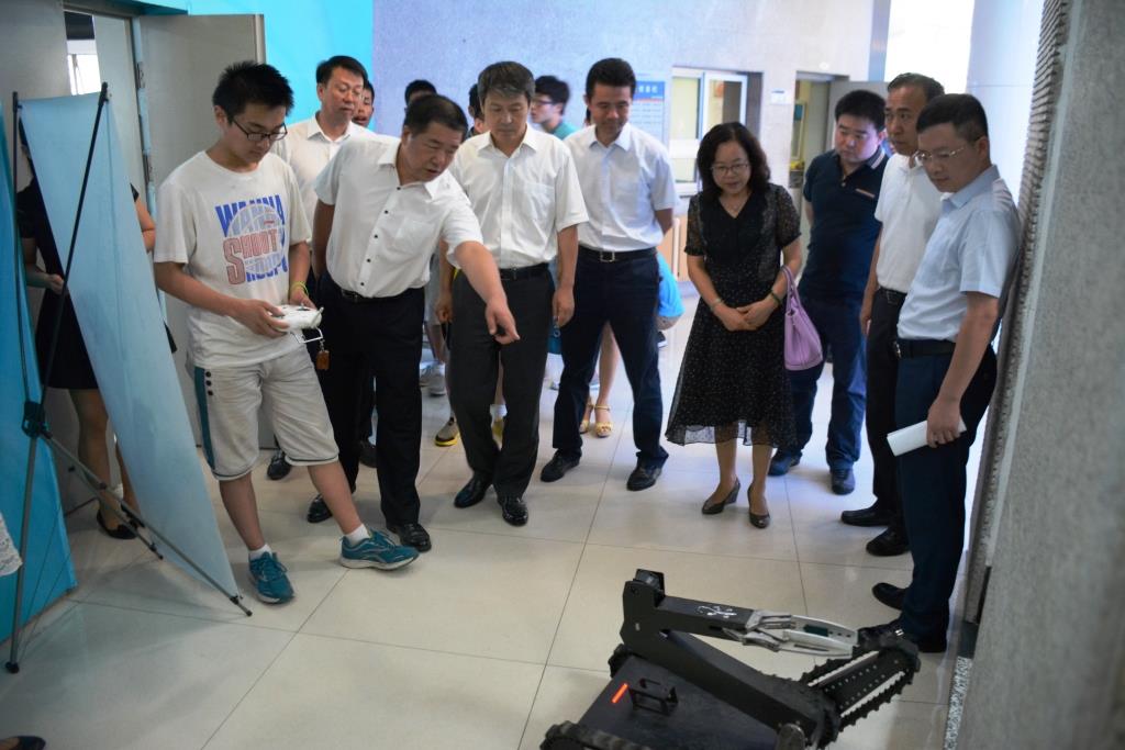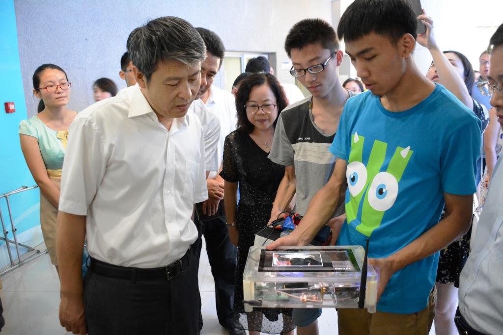参观过程中,区委书记冯守权观看了由我校ACTION创新团队带来的创新作品展示,并在智能汽车创新基地参观了正在备战2015年国赛的参赛队员们所带来的精彩智能汽车表演赛。全面了解了各创新实验室、创客空间等实践基地的运行情况后,冯书记与创新创业学生代表进行了亲切交流,对基地目前取得的育人成效给予了肯定,并鼓励学生们继续奋斗,努力在“大众创业、万众创新”浪潮中创造新价值。