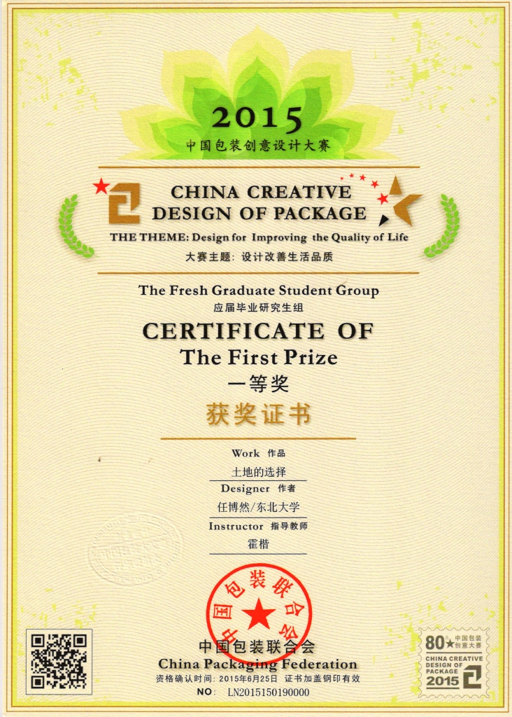 暑期,2015年中国包装创意设计大赛在杭州落下帷幕。由我校艺术学院霍楷老师指导、任博然同学自主设计完成的参赛作品《土地的选择》荣获本次大赛全国一等奖,其他参赛作品分获全国二等奖9项、全国三等奖24项。东北大学荣获团体优秀奖。