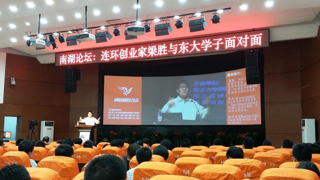 9月14日晚,由东北大学创新创业学院、东北区域超算中心、东网科技有限公司主办,东北大学学生科协创业推广中心承办的“南湖论坛:连环创业家梁胜与东大学子面对面”在科学馆201报告厅成功举行。东北大学创新创业学院常务副院长张立志,美国Rancher大中华区域经理秦小康,东网科技有限公司副总经理胡许冰、总经理助理曲佳,东网软澈总经理张帆以及东北大学的百余名创客、沈阳理工大学创业协会的同学参加论坛。