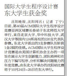 沈阳晚报、沈阳网讯 (记者 丁宁)日前,第40届ACM国际大学生程序设计竞赛亚洲区域赛长春站于东北师范大学举行,来自北京大学、华中科技大学、武汉大学等国内124所高校的220支代表队参赛。东北大学派出的3支参赛队伍斩获1金2银的佳绩。ACM国际大学生程序设计竞赛是由美国计算机协会主办的一项旨在展示大学生创新能力、团队精神和在压力下编写程序、分析和解决问题能力的年度竞赛。由东北大学承办的沈阳站比赛将于10月24日-25日在东大举行。 新闻来源 《沈阳晚报》2015年10月21日