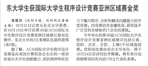 本报讯(沈阳日报、沈阳网记者杨主格)10月21日记者从东北大学获悉,在10月18日举行的第40届ACM国际大学生程序设计竞赛亚洲区域赛长春站比赛中,东北大学的3支参赛队伍最终获得1金2银。