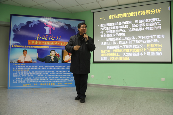 11月21日下午3时,由创新创业学院主办,KAB创业俱乐部承办的南湖论坛于科学馆206举行。本次活动邀请到教育部创业教育专家组组长、全国青年就业创业优秀导师李家华教授为东大师生开展了一场题为《经济新常态视阈下的创业教育生态系统优化》的主题讲座。