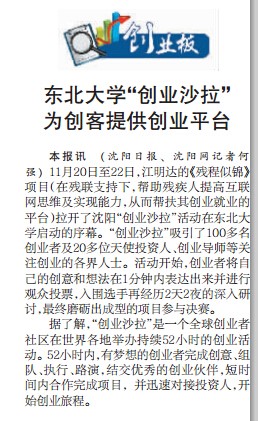 本报讯 (沈阳日报、沈阳网记者何强)11月20日至22日,江明达的《残程似锦》项目(在残联支持下,帮助残疾人提高互联网思维及实现能力,从而帮扶其创业就业的平台)拉开了沈阳“创业沙拉”活动在东北大学启动的序幕。“创业沙拉”吸引了100多名创业者及20多位天使投资人、创业导师等关注创业的各界人士。活动开始,创业者将自己的创意和想法在1分钟内表达出来并进行观众投票,入围选手再经历2天2夜的深入研讨,最终磨砺出成型的项目参与决赛。