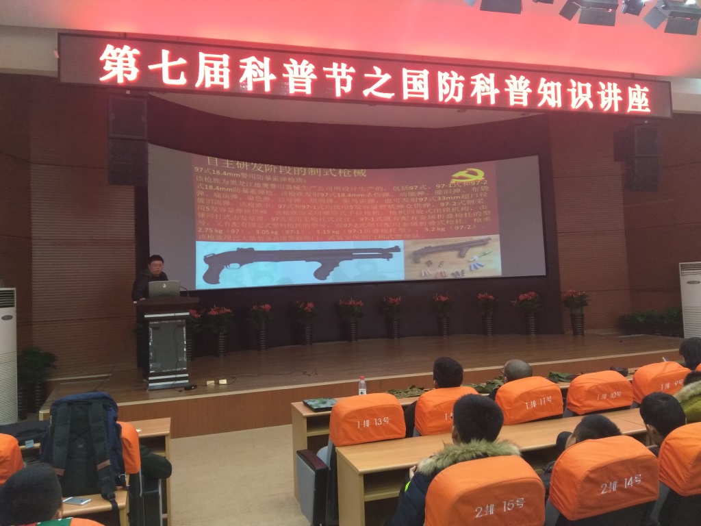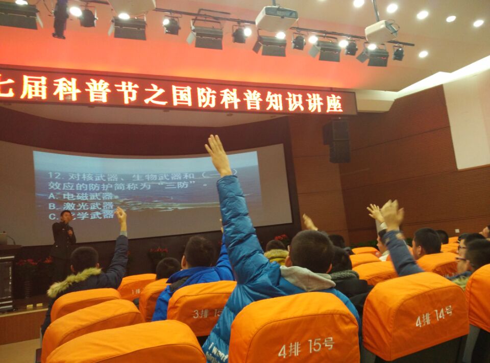 此次活动邀请两位资深的军事爱好者向大家讲解国防科普知识,讲座上半场主讲轻兵器,并展示了许多轻兵器的零部件,和许多大家没有亲眼讲过的武器配件,吸引了大家的眼球。讲座下半场主讲坦克装甲,主讲人的深情描述配合精心制作的ppt,使大家感受到了这陆战之王的铮铮铁骨在战场上的霸气威严。此次活动吸引了近百名同学到场,大家认真倾听着每一段知识要点并做记录,在讲座环节结束后主持人与观众进行了科普知识竞答的互动环节,知识竞答题目围绕第一环节的讲座内容所出题。同学们为展现刚刚所学到的科普知识,所有同学都很踊跃积极的举手抢答,竞答正确的每位同学均获得一份纪念奖,现场气氛活跃。竞答结束后主持人上台做活动总结并宣布活动结束,同学们依次退场。活动最后所有工作人员与老师一起合影留念。