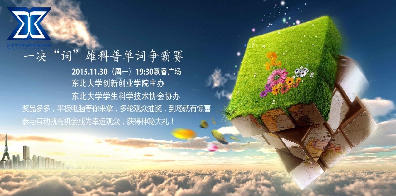 科技引领生活,普惠校园师生。由东北大学创新创业学院主办、东北大学学生科学技术协会承办的第七届大学生科普节之“一决‘词’雄”科普单词达人赛浑南校区总决赛于2015年11月30日晚7:30在浑南校区大学生服务中心飘香广场盛装开幕!