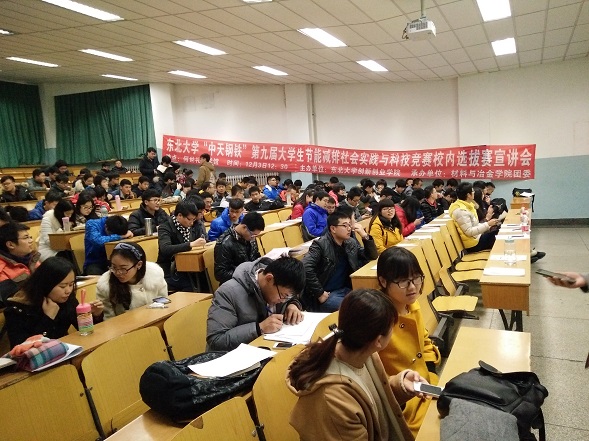 12月3日中午,由东北大学创新创业学院主办,材料与冶金学院学生科学技术协会承办的东北大学“中天钢铁”第九届大学生节能减排社会实践与科技作品竞赛校内选拔赛宣讲大会在何世礼教学馆顺利举行。创新创业学院竞赛部部长王平老师,材冶学院团委书记李炳熠老师,以及往届参赛优秀学生代表出席会议。