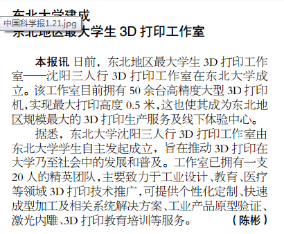 本报讯 日前,东北地区最大学生3D打印工作室——沈阳三人行3D打印工作室在东北大学成立。该工作室目前拥有50余台高精度大型3D打印机,实现最大打印高度0.5米,这也使其成为东北地区规模最大的3D打印生产服务及线下体验中心。
