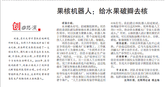 水果罐头好吃,但破瓣挖核难。刘浩的创业团队研发的智能水果去核机器人操作简单,可以快速为黄桃去核。机器人基于计算机视觉识别技术,整个流程完全模仿人工去核动作,实现了拟人化、智能化。