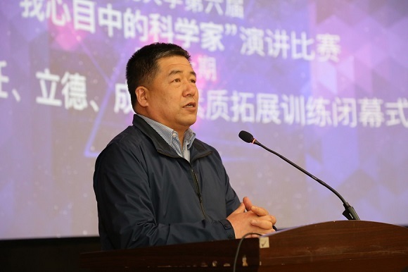 演讲比赛的同时还进行了第十期“责任、立德、成才”素质拓展训练营闭幕仪式。创新创业学院副院长贾建锋宣读了《关于表彰第十期“责任、立德、成才”素质拓展训练营优秀学员的决定》。创新创业学院常务副院长张立志回顾和总结了我校学生科研训练工作的重要举措和成效,并与全体学院分享了他心目中好学生的标准:扎实的专业功底、探索求真的好奇心、持之以恒的追求、坚持不懈的努力。张院长鼓励全体项目组成员以科学家精神为引领,在科研探索的道路上奋勇前行,努力成为卓越的科研工作者,践行青春梦想、缔造创新传奇。