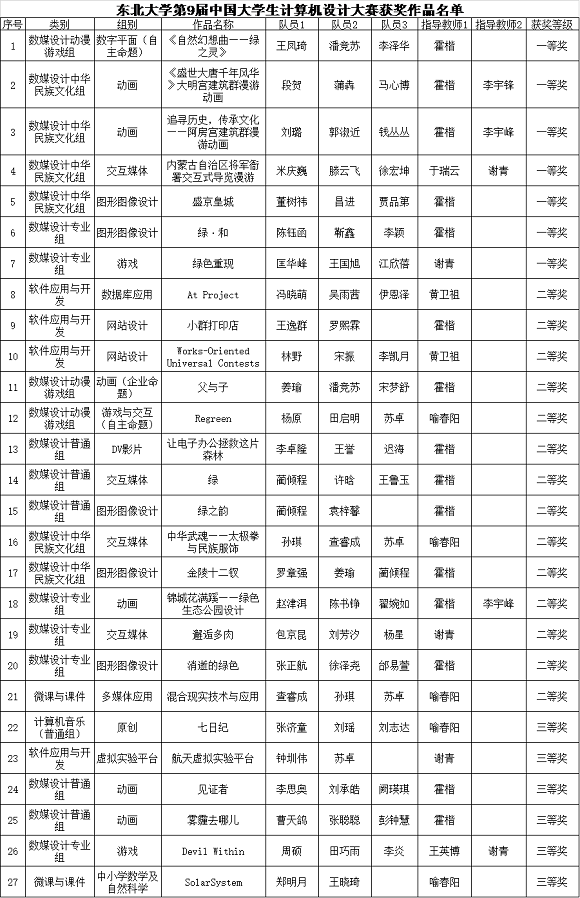 2016年7月23日-8月26日,第9届中国大学生计算机设计大赛分别在合肥、厦门、南京、宁波、上海等赛站开赛。经过校赛、省赛的选拔,共有来至全国440所高校的2320项作品入围本次竞赛。我校27项作品入围全国总决赛,经过现场展示及答辩,最终荣获一等奖7项,二等奖14项,三等奖6项。东北大学获得优秀组织单位奖。