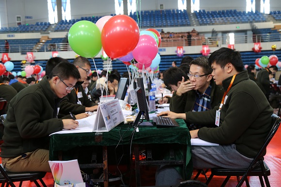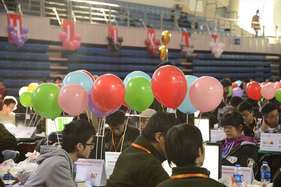 23日上午9:00,比赛正式开始。参赛选手们个个全神贯注,认真仔细阅读竞赛题目,时而专注思考,时而相互交流,刘长春体育馆内传出持续不断的键盘敲击声,一个个代表胜利的彩色气球不断升起在参赛队的赛台上。最终,经过5个小时的激烈角逐,北京邮电大学“北邮-菜菜的剑客”、浙江大学“Siunaus”、中山大学“SYSU-无敌过河”、华中师范大学“闪电劈中了番茄园的卫兵”等19个参赛队荣获金奖,北京航空航天大学“学习一个”、山东大学“企鹅保护协会”、复旦大学“冬日”、浙江大学“多米诺斯”等38个参赛队荣获银奖,苏州大学“爱生活!艳阳天!”、武汉大学“踢批踢歪优优歪”、南京航空航天大学“长者炒饭”、西安交通大学“威尔凯撒”等57个参赛队荣获铜奖。其中,来自北京大学的“红皇后”队荣获冠军,来自电子科技大学的“人生中的柠檬酱”队荣获亚军,来自北京理工大学的“大鳄鱼爱洗澡”队荣获季军。