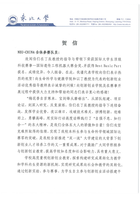 10月31日,国际遗传工程机器大赛(international Genetically Engineered Machine Competition,iGEM)在美国波士顿圆满落幕。由我校生命健康与科学学院丁辰教授指导的“NEU-CHINA”代表队从306支参赛队伍中脱颖而出,一举获得金奖,同时获得Best Basic Part提名,实现了东北大学本科生参与生命科学领域国际比赛零的突破。校长赵继亲发贺信,代表学校对“NEU-CHINA”全体参赛队员表示祝贺,向生命科学与健康学院和以丁教授为代表的创新创业活动优秀指导教师表示诚挚的问候。