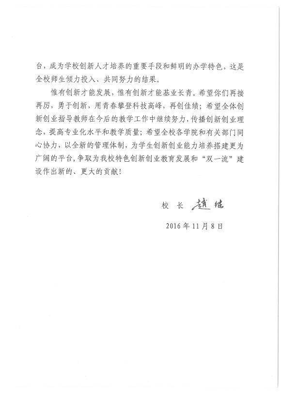 惟有创新才能发展,惟有创新才能基业长青。赵继希望,全体参赛队员以竞赛成绩取得为契机,再接再厉,勇于创新,用青春攀登科技高峰,再创佳绩;全体创新创业指导教师在教学工作中传播创新创业理念,进一步提升专业化水平和教学质量;全校各学院有关部门同心协力,以全新的管理体制,为学生创新创业能力培养搭建更为广阔的平台,争取为我校特色创新创业教育发展和“双一流”建设作出新的、更大的贡献。