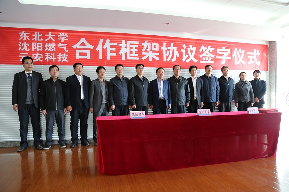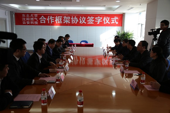 2016年11月29日9:00,东北大学、沈阳燃气公司、云安科技公司合作框架签字仪式于东北大学综合楼1401举行。东北大学校长赵继,沈阳燃气公司(以下简称沈阳燃气)董事长卢俊,云安科技有限公司(以下简称云安科技)CEO、东北大学材料学在读博士生沈波等出席了本次签字仪式。