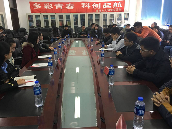 2016年10月23日,“多彩青春,科创起航—沈航东大科协交流会”在沈阳航空航天大学机械馆成功举行。出席本次会议的有东北大学(浑南校区)学生科学技术协会主席团代表、对外交流部和新闻部。沈阳航空航天大学大学生科技创新协会、数学建模协会、计算机博弈协会、芯7G航天协会和ETC科技创新协会。