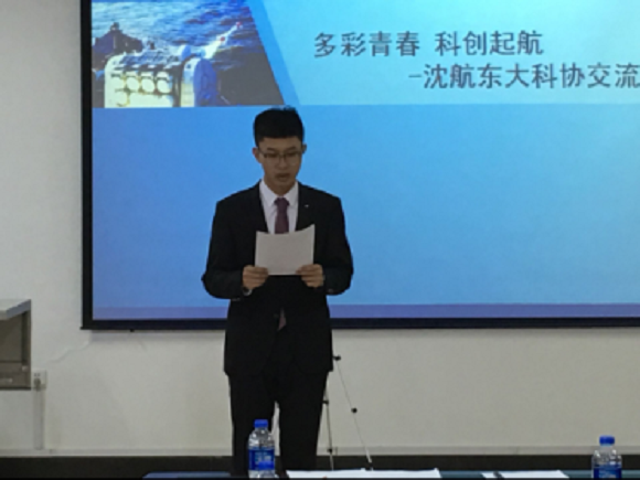 在沈阳航空航天大学主持人的简单介绍后,交流会正式开始。首先由沈阳航空航天大学大学生科技创新协会主席李爽发言,他对东大科协成员的到来表示感谢,并表达了与东北大学科学技术协会交流合作,取长补短的美好愿望。