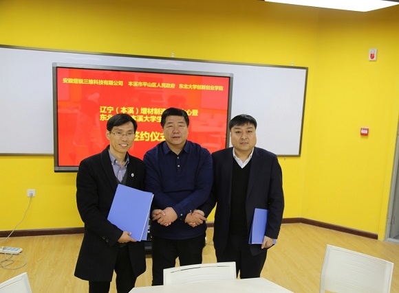 2017年3月3日下午,本溪市平山区人民政府与东北大学创新创业学院、安徽煜锐三维科技有限公司共建辽宁(本溪)增材制造创新中心暨东北大学-本溪大学生双创基地战略合作签约仪式在科学馆302室举行。本溪市平山区人民政府区长王胜秋、东北大学创新创业学院常务副院长张立志、安徽煜锐三维科技有限公司总经理高宇博、沈阳博瑞未来科技有限公司总经理刘汉通出席仪式。
