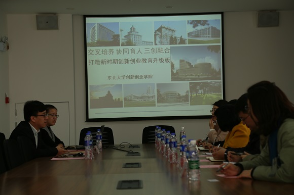 贾建锋院长以“强化三融合,打造新时期创新创业教育升级版”为题介绍了东北大学创新创业教育概况,黄晓颖部长介绍了学生创新创业基地基本情况。之后,两校就创新创业师资队伍建设、课程建设、政策激励、制度建设、职能划分等方面进行了深入交流。