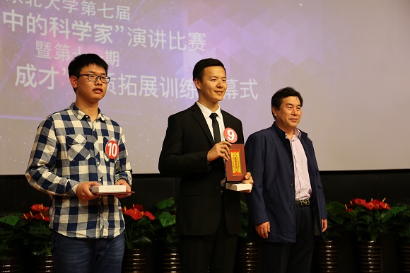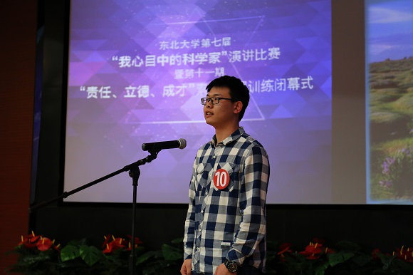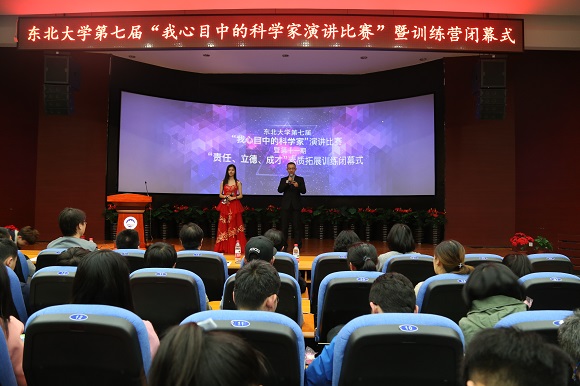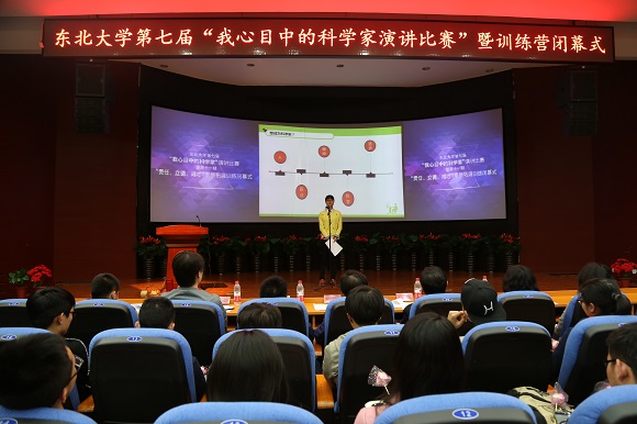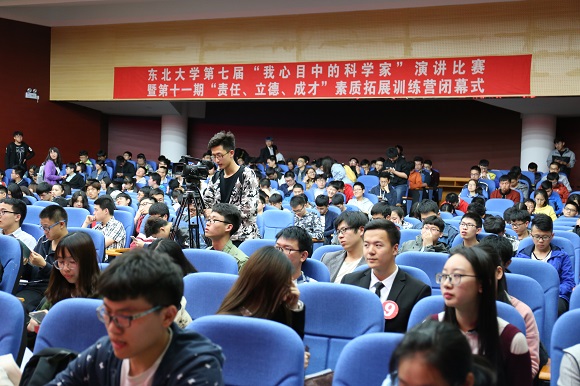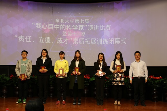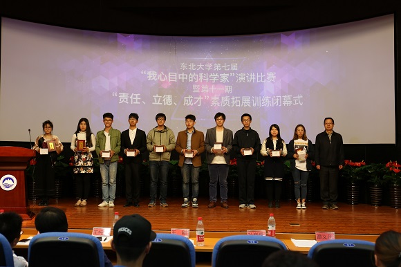4月26日晚18:30,东北大学第七届“我心目中的科学家”演讲比赛暨第十一期“责任、立德、成才”素质拓展训练营闭幕式在南湖校区科学馆201报告厅举行。经过“我心目中的科学家”主题征文评选活动,11名同学在800多篇征文中脱颖而出,荣获一等奖并入围本次演讲比赛。东北大学学生工作处副处长王纯武、校团委副书记刘海军、创新创业学院副院长王刚、艺术学院团委书记娄洹博、材料学院团委书记孙巍巍、学生指导服务中心学生资助管理中心副主任袁雨辰、资土学院谭义凡担任评委。创新创业学院项目部部长朱翠兰以及第十一批“大学生创新训练计划”全体项目组成员参加了此次活动。