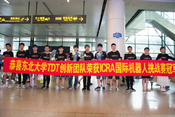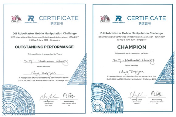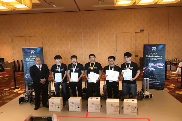 2017年5月30日-31日,ICRA2017Robomaster机器人挑战赛在新加坡举行。由东北大学机械学院陆志国、刘冲,计算机学院陈刚指导的东北大学T-DT(Thinking-Doing to Theory)机器人创新团队张宏斌、倪学斌、杨雄、成天佑等5人组成的东北大学T-DT代表队历经两天的鏖战,以全场最高积分获得ICRA2017Robomaster机器人挑战赛冠军,并斩获特别大奖。