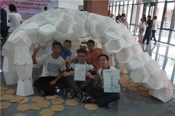 本次实体搭建大赛是创新创业学院主办,学院学生科学技术协会承办的精品科普立项活动之一,历时30天,总计100余名学生组成的21支队伍参赛。比赛分为草模评选、实体搭建、可行性实验三个部分。比赛初期,参赛选手提交了搭建实体草摸,确定设计主题,由陈雷老师担任主评委确定9组决赛名单。实体搭建过程中,参赛学生利用瓦楞纸板、PP中空板、竹条、麻绳、清漆、塑料布等作为原材料,结合建筑学知识,综合外观设计与力学分析,发挥创意,搭建占地5平米的实体小屋,并完善内部建筑空间。最终根据专业评委的综合考评,第三组《囚光》凭借设计新颖、结构稳固、建筑细节精细等特点获得一等奖,第十八组《蜂蜜味菠萝》获得二等奖,第一组《交织》、第六组《竹筑》、 第十三组《H.T.M》( 蜂巢榫卯)、 第十九组《GROUP》荣获三等奖,学院也将结合“筑梦工程”育人计划对获奖选手进行奖学金资助奖励。