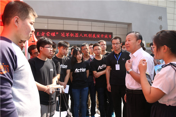 本次双创周中最引人关注的莫过于“王者荣耀”冠军机器人双创展演开放日的系列活动。9月16日,步入科学馆门前的广场,映入眼帘的是一派热闹非凡的景象,一顶顶的红色帐篷格外夺人眼球。为助力沈阳的双创周活动、宣传机器人技术,对接科技成果,我校在全国乃至世界机器人大赛中享有盛誉的ACTION、T-DT、牛牛等冠军机器人团队在此次开放日进行了“超级集装箱”移动操纵机器人表演、“碟中碟——月球探测”机器人投掷表演、“战地英雄”机器人互攻表演以及AI技术、工业机器人原型机展,与沈阳市民共享王者荣耀。