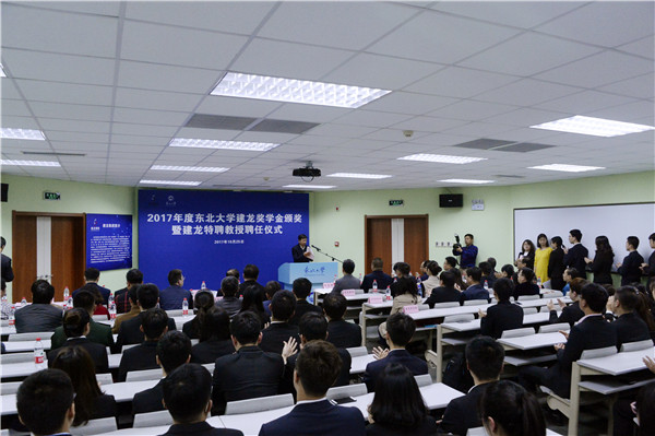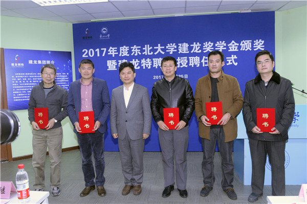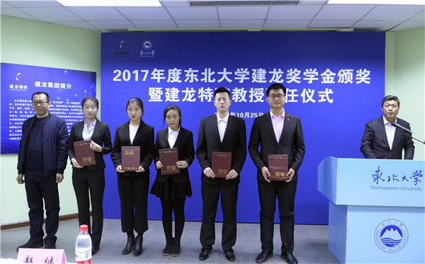 孙雷宣读了2017年度东北大学建龙奖学金表彰决定,魏国栋宣读了2017年度建龙特聘教授名单,张志祥为丁桦等10位建龙特聘教授颁发聘书,建龙集团子公司领导为建龙奖学金获奖学生颁发证书。