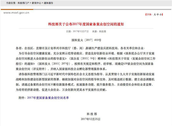 科技部关于公布2017年度国家备案众创空间的通知