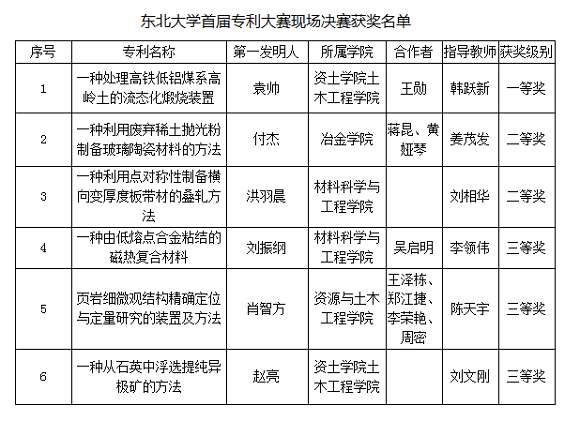 决赛现场,参赛选手重点围绕作品申报书中涉及的作品简介,设计实施方案,有益效果、主要技术指标和用途,市场前景和创业计划等内容开展陈述。评审团结合答辩情况现场问辩,并对专利作品创意设计的新颖性、合理性、实用性、申报书完整规范性、市场前景和创业计划科学性进行综合评定。经过激烈角逐,本次大赛共评选产生一等奖1项、二等奖2项、三等奖3项。其中,一等奖获奖作品《一种处理高铁低铝煤系高岭土的流态化煅烧装置》由资源与土木工程学院的袁帅、王勋完成,韩跃新老师指导。