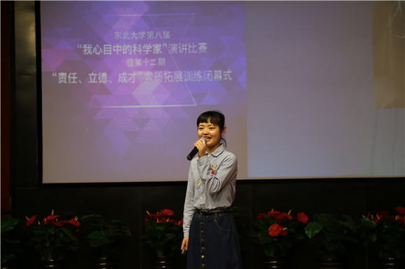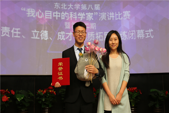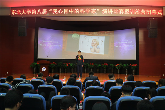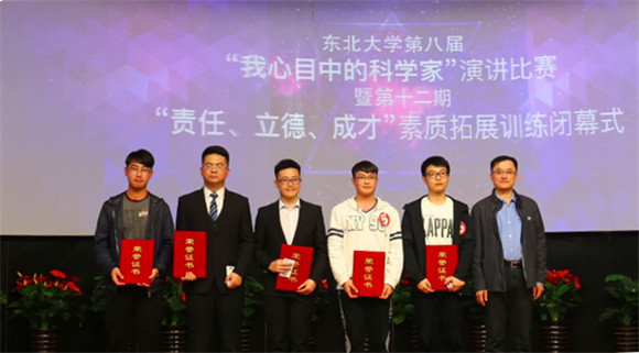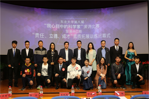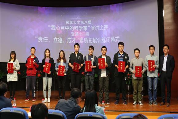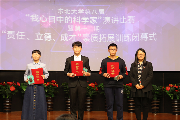 (通讯员朱翠兰)4月27日晚18:30,东北大学第八届“我心目中的科学家”演讲比赛暨第十二期“责任、立德、成才”素质拓展训练营闭幕式在南湖校区科学馆建龙学术报告厅举行。经过“我心目中的科学家”主题征文评选活动,10名同学在400多篇征文中脱颖而出,荣获一等奖并入围本次演讲比赛。东北大学学生工作处副处长王纯武、创新创业学院副院长贾建锋、校党委宣传部校报编辑部主任杨明、校团委学生团体部部长孙坤、学生指导服务中心学生资助管理中心主任王威、艺术学院团委书记娄洹博、创新创业学院项目部部长朱翠兰以及第十二批“大学生创新训练计划”全体项目组成员参加了此次活动。