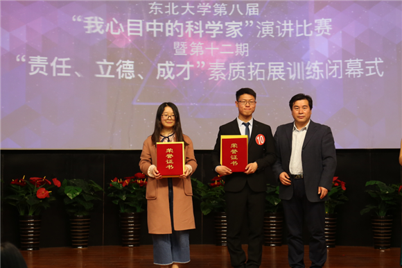 演讲比赛的同时还进行了第十二期“责任、立德、成才”素质拓展训练营闭幕仪式,创新创业学院副院长贾建锋现场宣读了《关于表彰东北大学第十二期“责任、立德、成才”素质拓展训练营优秀学员的决定》。文法学院张焕涛、理学院张恩达、机械学院程帅康、计算机学院胡彬梅、生命学院李之兴等32名同学获评“东北大学第十二期‘责任、立德、成才’素质拓展训练营优秀学员”荣誉称号。