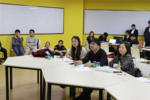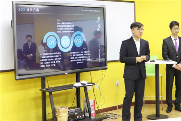 答辩会正式开始,各支队伍逐一上台对自己的参赛作品进行介绍,内容包括作品的创意来源、相关资料收集以及团队制作过程等方面。参赛成员也借助PPT以及视频短片等更直观的方式向评委及在场同学展示自己的作品。每支队伍讲解完毕,评委老师都会根据其作品就某一点创意及制作进行更为细致的提问与点评,同时会根据各支队伍的创意及在场表现现场打分。下午5:30,全部参赛队伍都已完成此次评审会答辩。