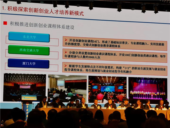 中国高等教育学会创新创业教育分会会长、中南大学原党委书记高文兵在会上作了题为“坚持中国特色社会主义教育发展道路 深化高校创新创业教育改革”的工作报告,报告高度总结概括了各高校创新创业教育工作的借鉴经验及最新成果,指出东北大学积极推进创新创业教育课程体系建设,不断形成基础知识普及、专业课程融入、实用技能提升的梯度型、交错式的创新创业教育课程体系,肯定了东北大学创新创业教育取得的累累硕果。东北大学作为首批(2017年)入选典型经验高校还将继续积极探索,全面贯彻落实全国教育大会及新时代全国高等学校本科教育工作会议精神,以更积极的探索精神及创新实践期待取得更优异的成绩!