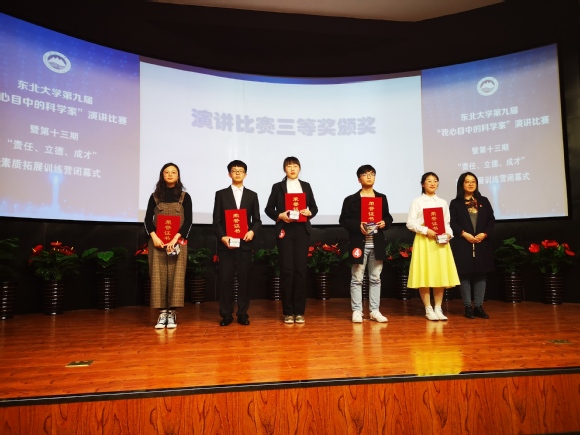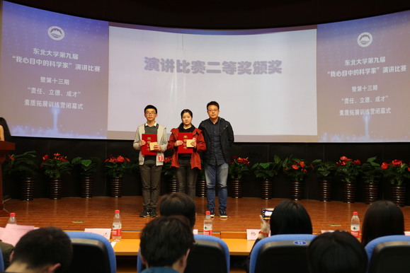 演讲比赛的同时还进行了第十三期“责任、立德、成才”素质拓展训练营闭幕仪式,创新创业学院副院长王刚现场宣读了《关于表彰东北大学第十三期“责任、立德、成才”素质拓展训练营优秀学员的决定》。文法学院宋锐辉、马克思主义学院单立业、冶金学院石劢、材料科学与工程学院刘靖达、机械工程与自动化学院王锦鸿等29名同学获评“东北大学第十三期‘责任、立德、成才’素质拓展训练营优秀学员”荣誉称号。