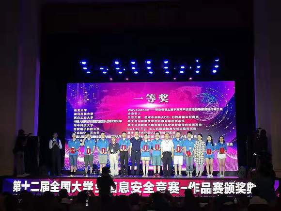 7月31日-8月3日,第十二届全国大学生信息安全竞赛作品赛在南京东南大学四牌楼校区举行。共有来自全国116所高校499支队伍参加本次竞赛,我校由软件学院徐剑老师指导,李慧玲、易文佳、邹雅毅、叶子怡四名同学组成的团队参赛作品《WaveDance-移动设备上基于高频声波信道的隐蔽信息传输工具》,经过初评遴选成功晋级现场决赛,并通过现场答辩和作品展示等环节,从众多作品中脱颖而出,荣获全国一等奖。徐剑老师获评优秀指导教师称号。