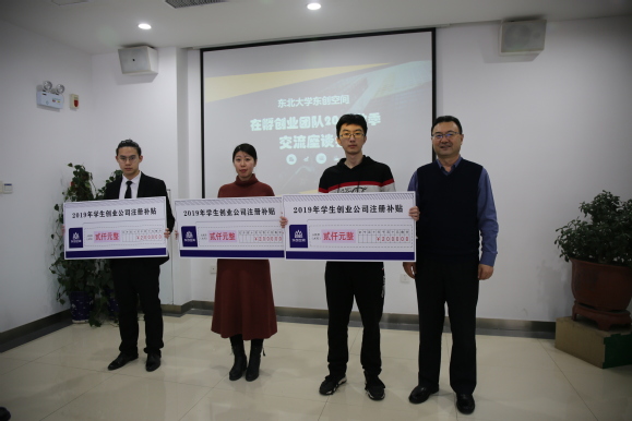 会上通报了我基地2019年新增高新技术企业和科技小巨人企业情况,并由沈阳国际软件园产业服务集团副总裁李辉和创新创业学院副院长黄达为2019年新注册的8家企业颁发了2019年学生创业团队注册补贴。