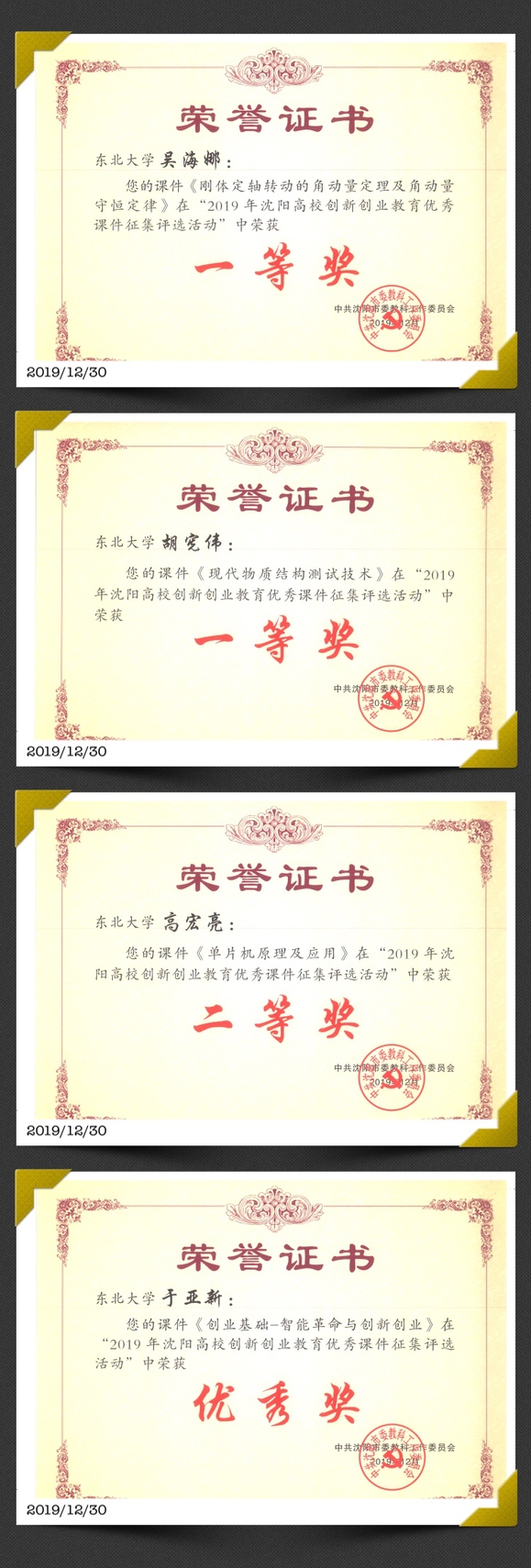 据悉,我校参赛教师收获颇丰,荣获一等奖2人,二等奖1人,优秀奖1人。其中,理学院吴海娜的《刚体定轴转动的角动量定理及角动量守恒定律》、冶金学院胡宪伟的《现代物质结构测试技术》荣获2019年沈阳高校创新创业教育优秀课件评选活动一等奖;信息科学与工程学院高宏亮的《单片机原理及应用》荣获2019年沈阳高校创新创业教育优秀课件评选活动二等奖;计算机科学与工程学院于亚新的《创业基础——智能革命与创新创业》荣获2019年沈阳高校创新创业教育优秀课件评选活动优秀奖。