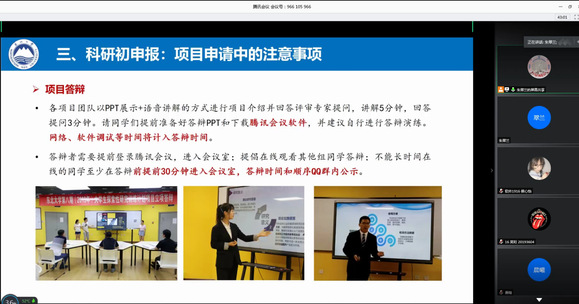 会上,朱翠兰老师从以“国创计划”为核心的东北大学东北大学科研训练体系的基本架构为出发点,阐述了大学生探索性研究训练计划项目的发展历程和重要价值,并针对项目实施方案、奖励政策和申报过程中的注意事项做了详细解析。来自全校各学院有兴趣参与该计划的大一、大二年级学生在线倾听了本次宣讲,所有参会人员通过在线问答方式开展了交流与互动。
