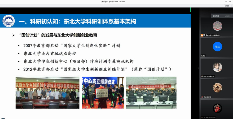 6月4日下午12:50,东北大学第九批大学生探索性研究训练计划项目宣讲会通过腾讯会议平台举行,创新创业学院项目部部长朱翠兰做了《科研初体验:让梦想更近一步》专题报告。