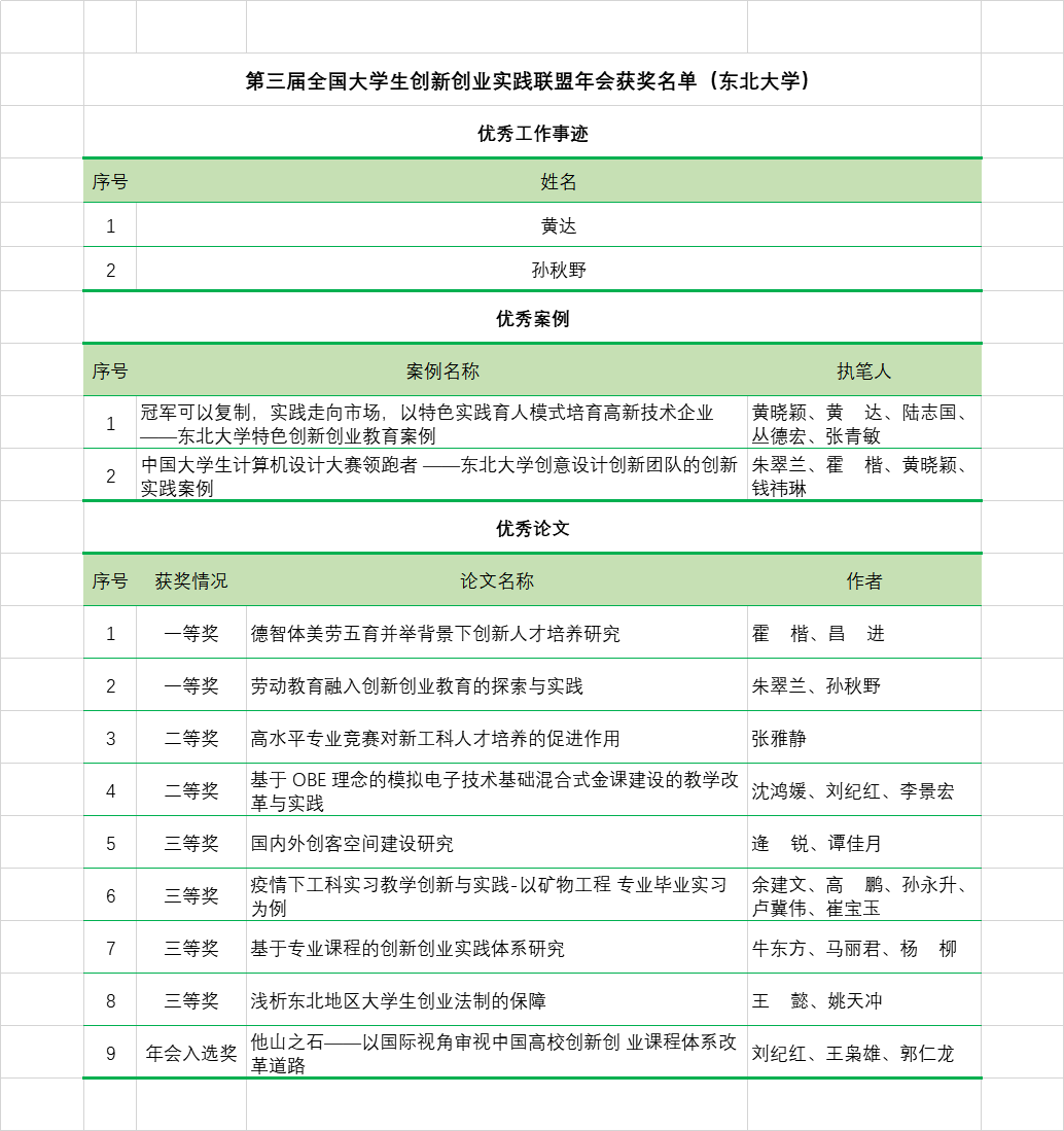 大会同期发布了第三届全国大学生创新创业教育联盟年会优秀案例、优秀论文、指导教师优秀事迹等奖项的评选结果,东北大学荣获指导教师优秀事迹2项,创新创业教育优秀案例2项,优秀论文一等奖2项,二等奖2项,三等奖4项,年会入选奖1项,并第三次荣获优秀组织单位。