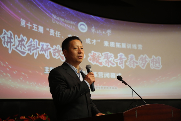 比赛现场还举行了简短的训练营闭幕仪式。与会全体人员通过视频回顾了东北大学第十五期“责任、立德、成才”素质拓展训练营相关活动。创新创业学院副院长王刚致闭幕辞。王院长充分肯定了本次活动的重要价值,认为素质拓展训练营尤其是“讲述科研故事·凝聚青春梦想”主题演讲比赛在引领学生关注科研、国情、热会热点等方面起到了重要推动作用。他鼓励当代大学生将文化知识拓展、创新能力培养、品德修养提升有效结合,通过训练营活动汲取奋进的力量,提高自身对科研的认识,真正实现从“要我做”到“我要做”的转变,在修身、立德、科研、创新的道路上奋勇前行,争取在未来科技创新中国的建设中增添越来越多的东大元素、贡献东大智慧,将青春梦想融入国家民族发展的伟大征程。