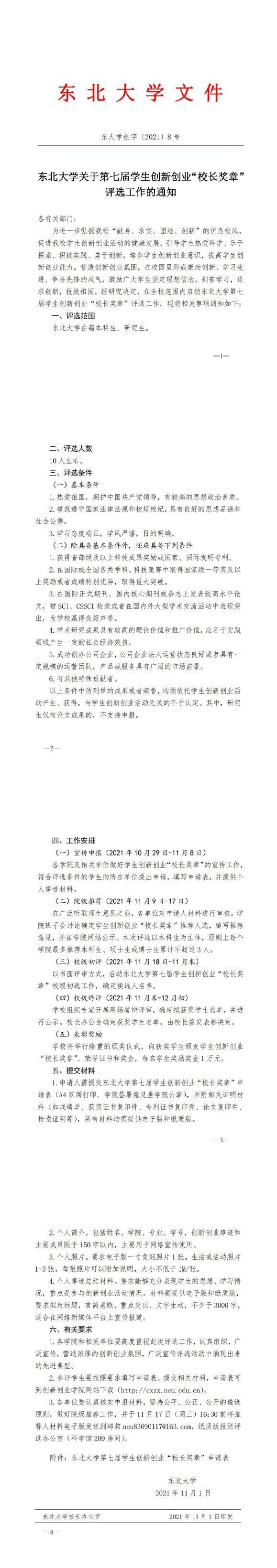 东北大学关于第七届学生创新创业“校长奖章” 评选工作的通知