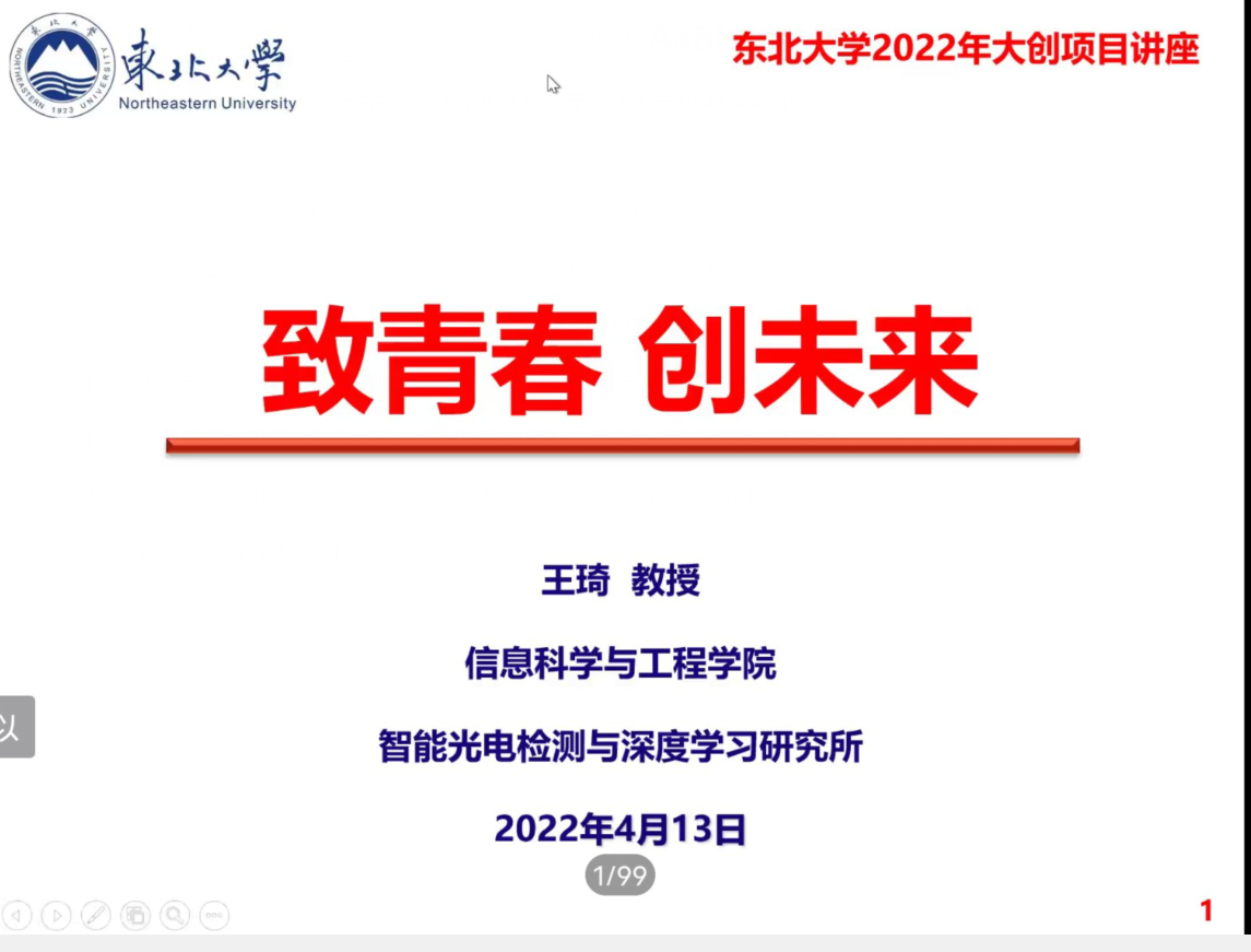 东北大学第十六期“责任、立德、成才”素质拓展训练营之“致青春,创未来”专题讲座于4月13日通过腾讯会议成功举办。智能光电检测与深度学习研究所主任,信息科学与工程学院王琦教授受邀作本场报告。报告中,王琦教授以“致青春,创未来”为主题,为第十六批大学生创新训练计划项目的项目组成员开展了一场妙趣横生、精彩绝伦的专题讲座。王琦教授以如何做好科研、课题为主线,分别从项目初期,中期检查,结题答辩三个讲述了大创项目的技巧经验。