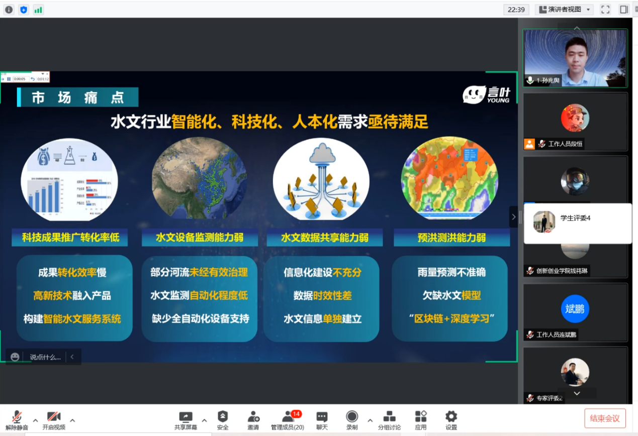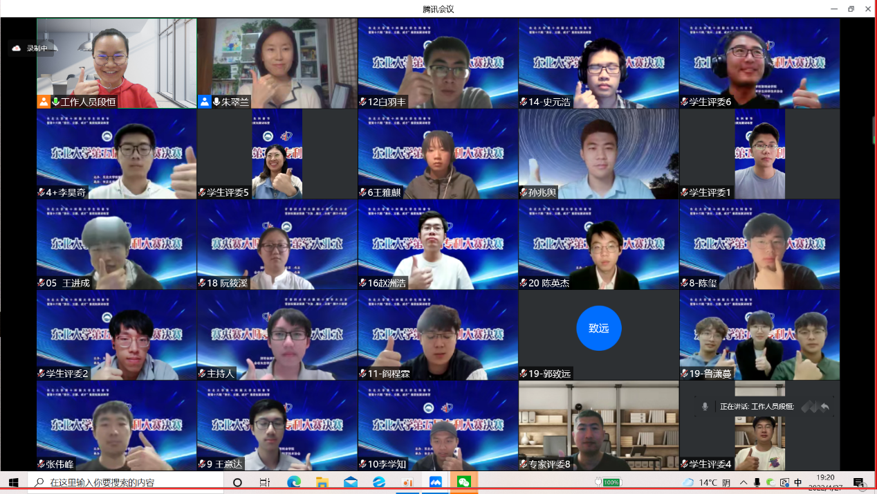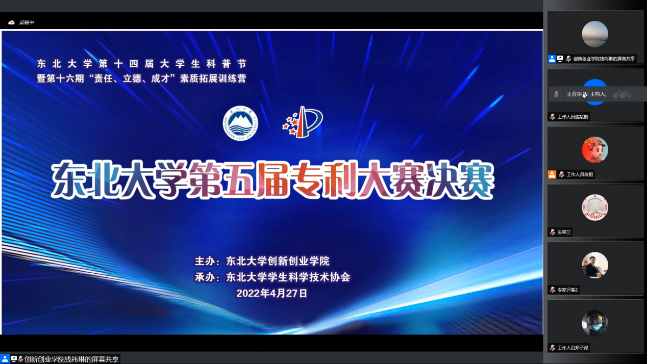 2022年4月27日下午14:00,东北大学第十四届大学生科普节主体活动之东北大学第五届专利大赛决赛通过腾讯会议举行。经过初赛选拔,共计22项专利成果入围决赛环节。学校特邀专业相关领域的专利机构代表、创业导师代表、创新导师代表、创新创业优秀学生代表共计14人组成评审团,对入围作品开展线上答辩评审。